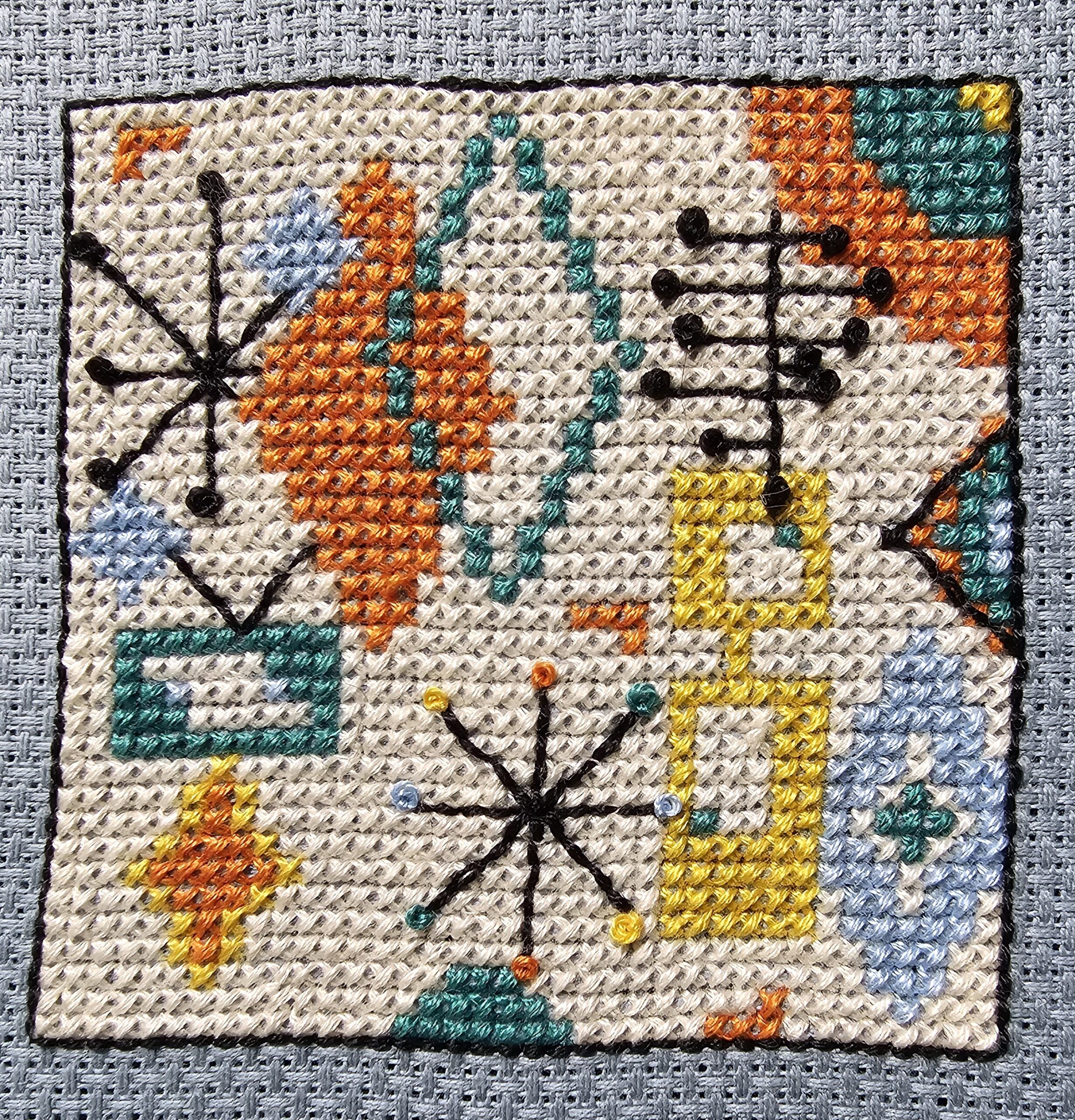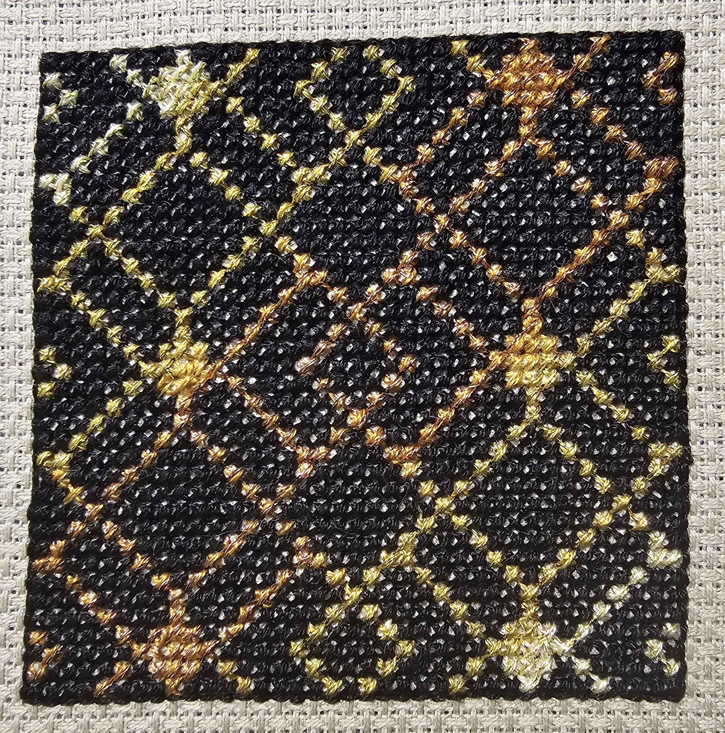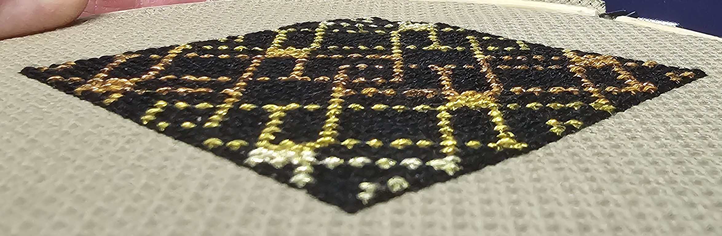 Putting on the Glitz – This Art Deco pattern has metallic thread in it to make it glitzy. By combining the strand of metallic thread with a strand of normal embroidery floss, the issues with the metallic thread getting all tangled up diminishes quite a bit. Also, I found that keeping my finger tips moistened also helped because it was easier to keep the strands smooth. Lastly, keep the strands to 15″ or less.