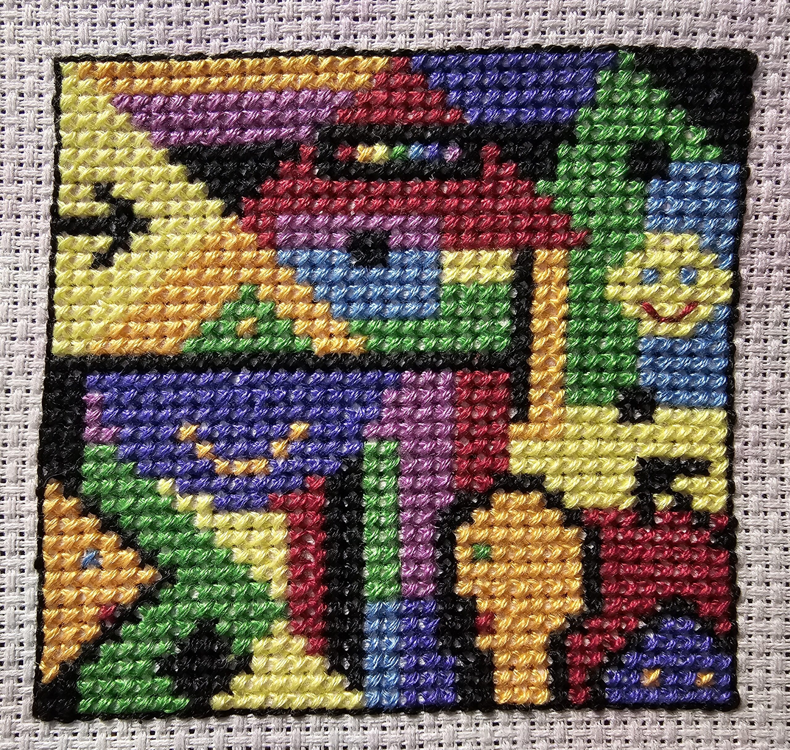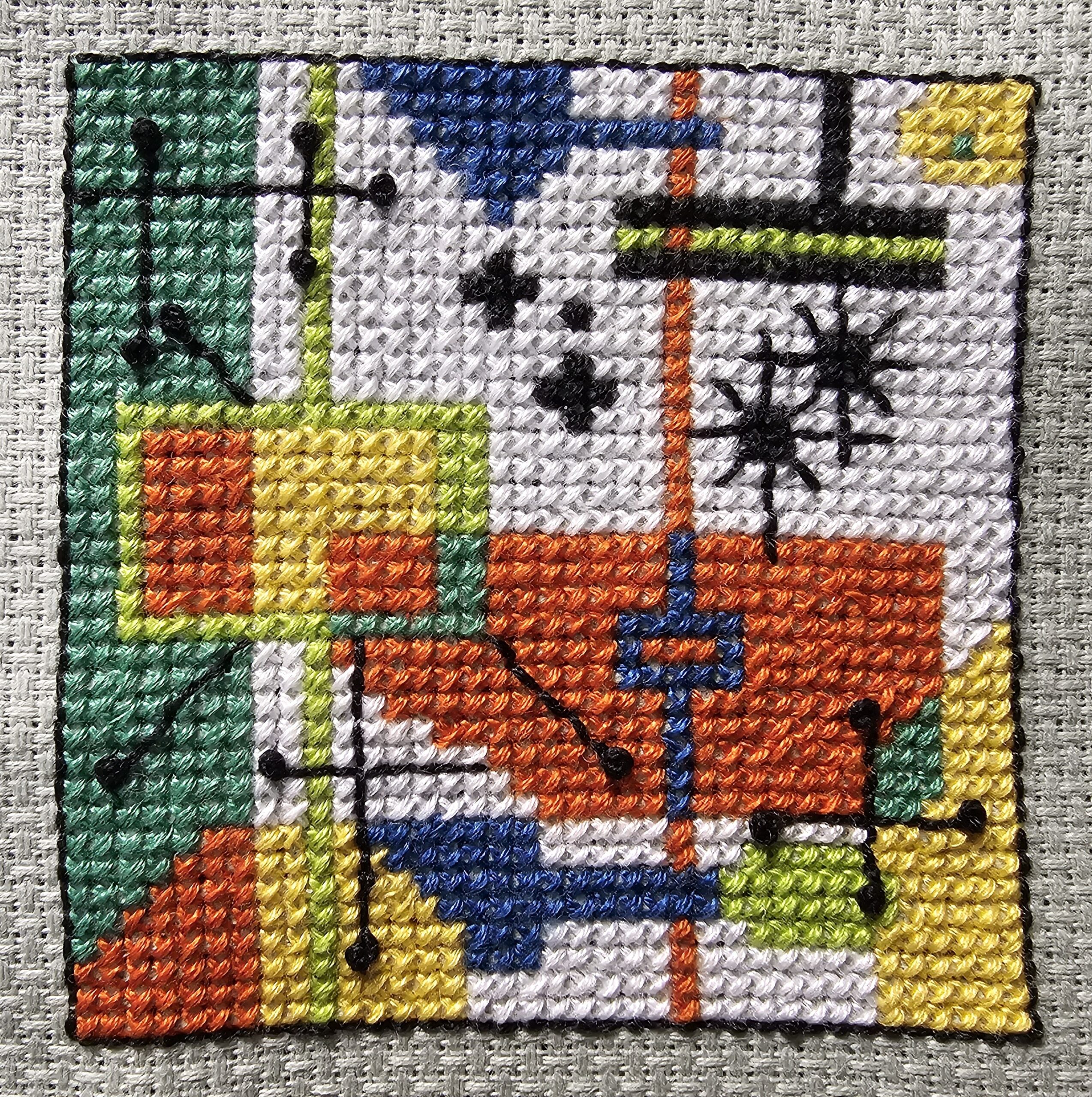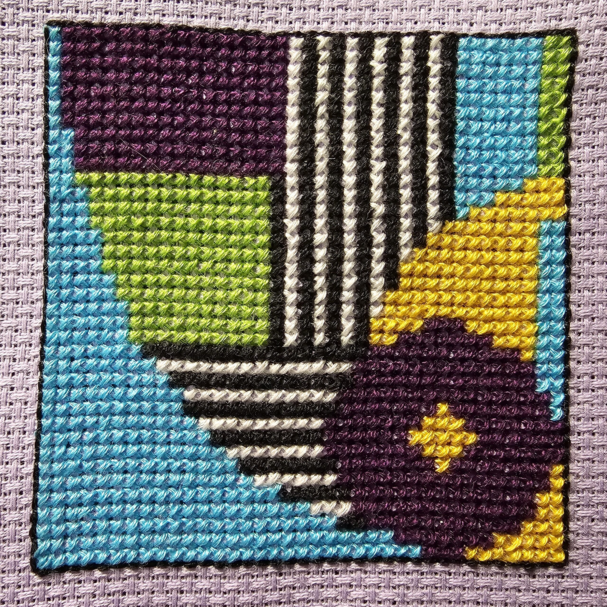 Putting on the Glitz – This Art Deco pattern has metallic thread in it to make it glitzy. By combining the strand of metallic thread with a strand of normal embroidery floss, the issues with the metallic thread getting all tangled up diminishes quite a bit. Also, I found that keeping my finger tips moistened also helped because it was easier to keep the strands smooth. Lastly, keep the strands to 15″ or less.